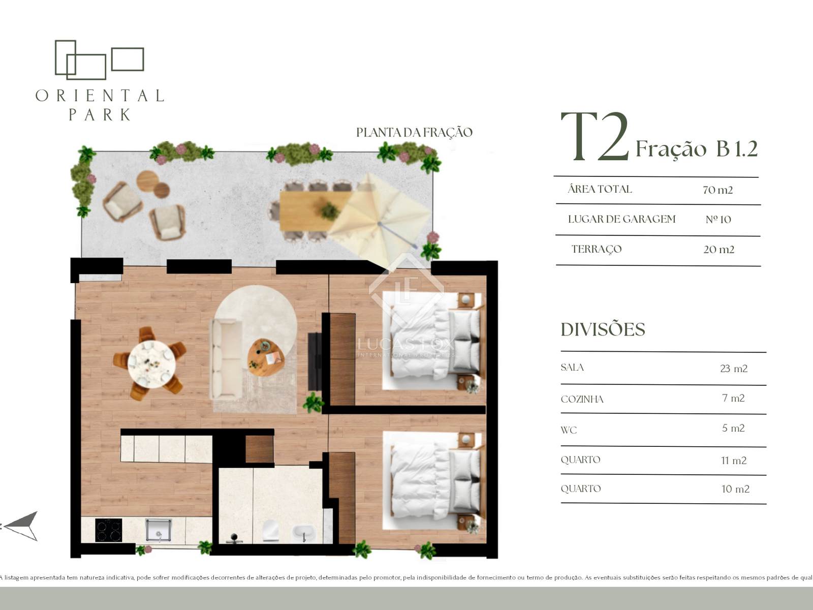 Appartamento con 2 camere da letto, con una superficie privata lorda di 70 m2 , una terrazza di 20 m2 e un posto auto.