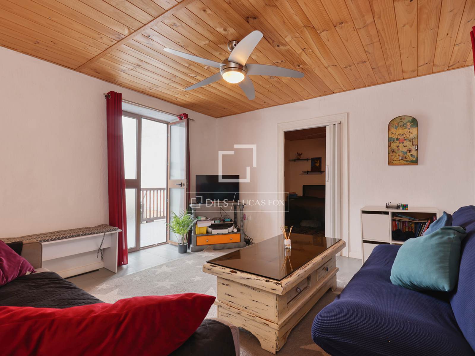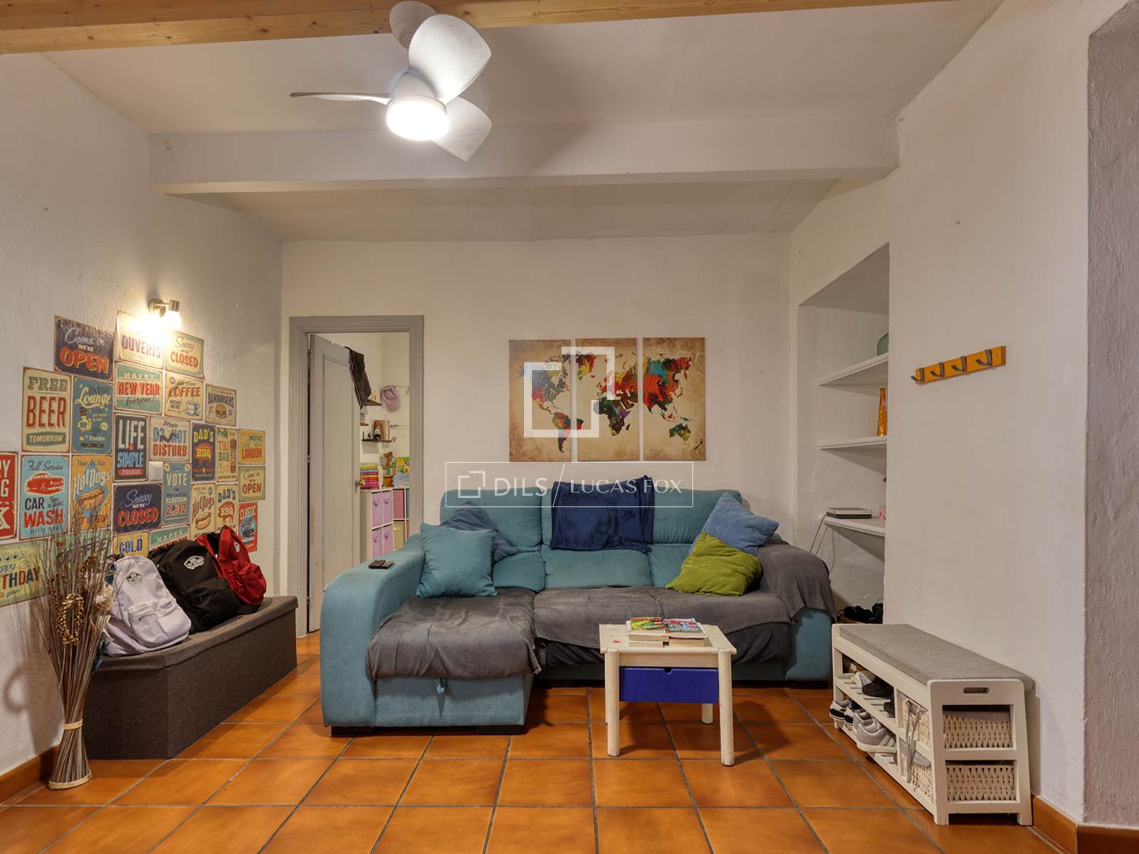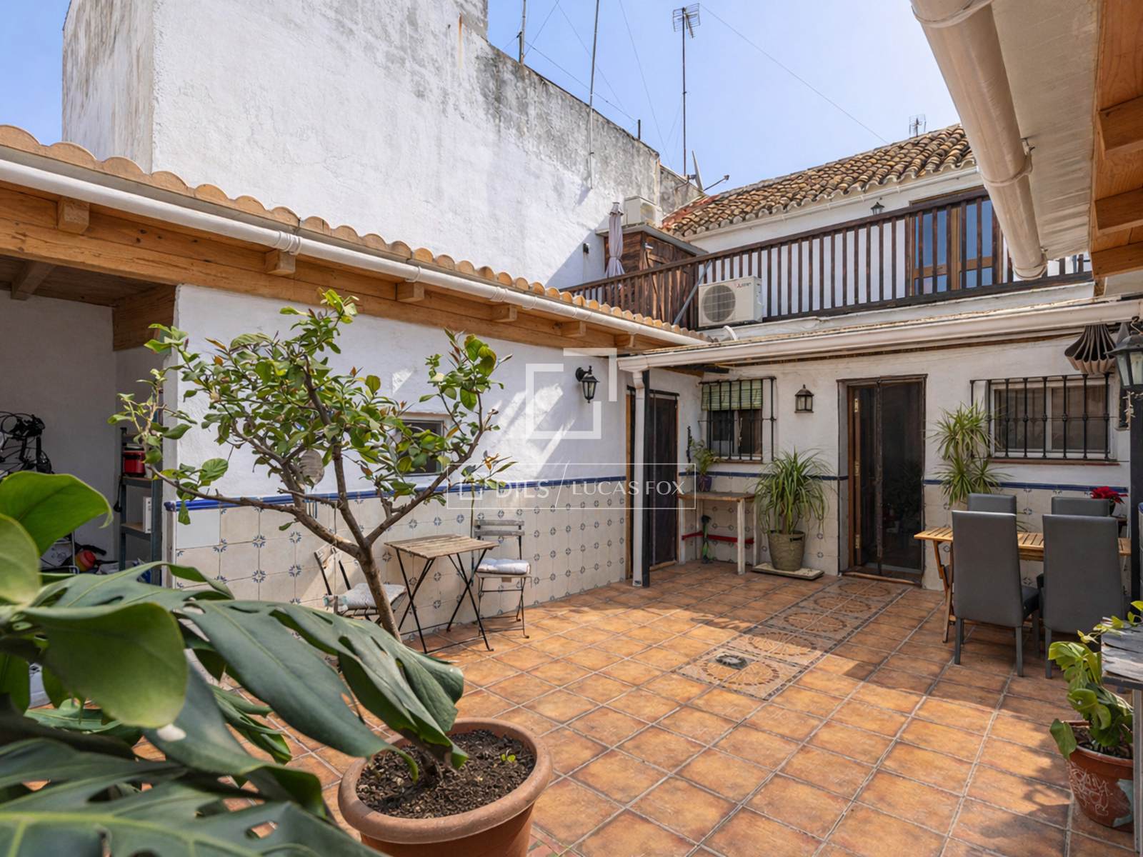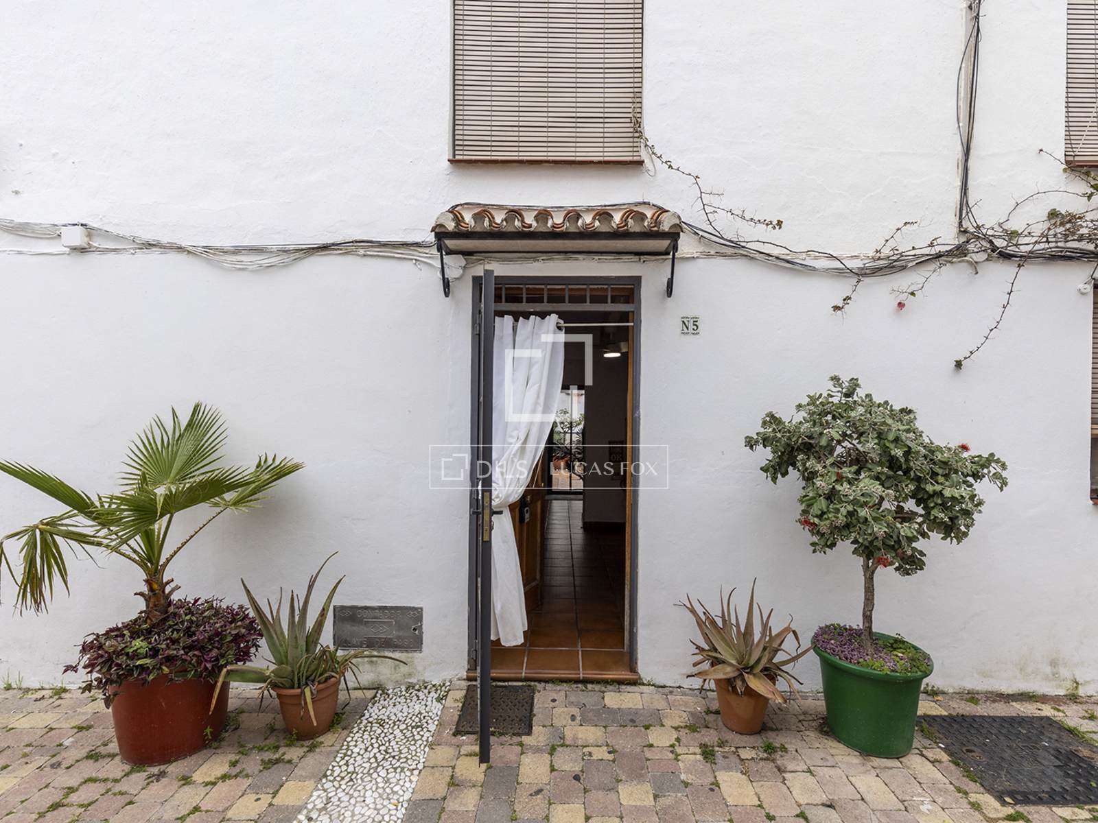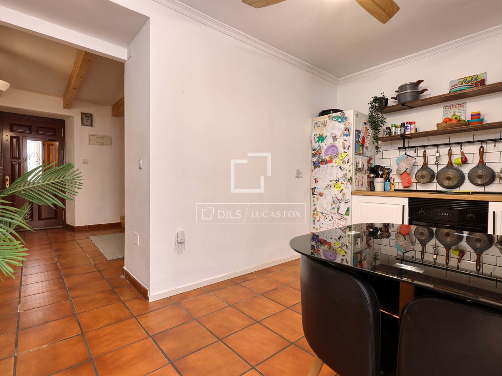 L'ingresso si apre sulla zona giorno principale, uno spazio accogliente caratterizzato da travi in legno color pino che riflettono il carattere delle case andaluse. A destra dell'ingresso si trova la prima delle tre camere da letto. Sotto la scala, è comodamente sistemato un bagno per gli ospiti.