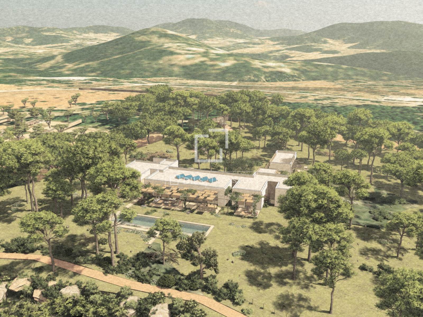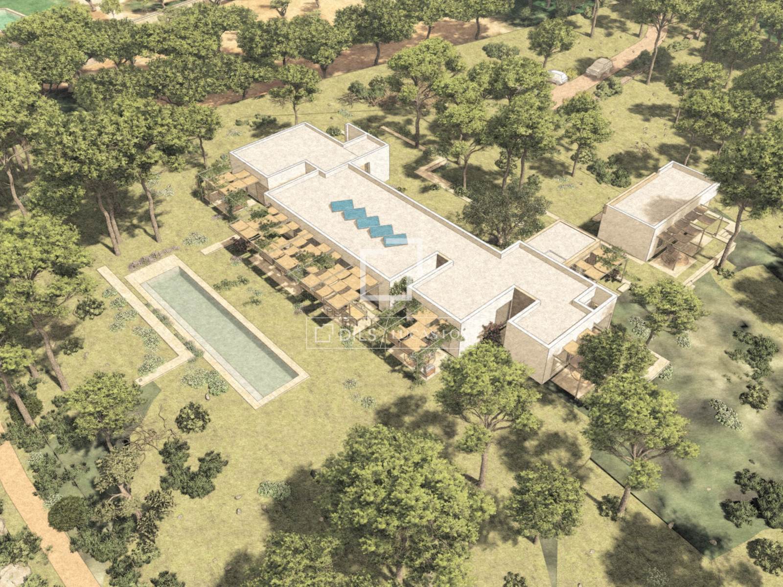 Il progetto comprende una spaziosa casa principale di 400 m² con ampi spazi abitativi e di intrattenimento, completata da una dependance separata di 60 m² e da un seminterrato di 115 m².