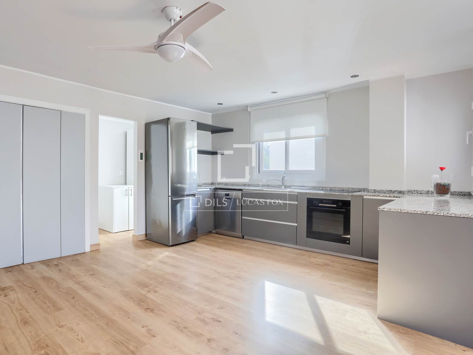 L'appartamento dispone di una cucina open space completamente attrezzata, che si collega perfettamente a un'ampia zona giorno/pranzo, ideale per rilassarsi o intrattenersi. Offre due ampie camere da letto, di cui una principale luminosa con bagno privato, e uno spazio ufficio separato, perfetto per lavorare da casa o trasformabile in una sala multiuso. Un secondo bagno completo completa la disposizione degli interni.