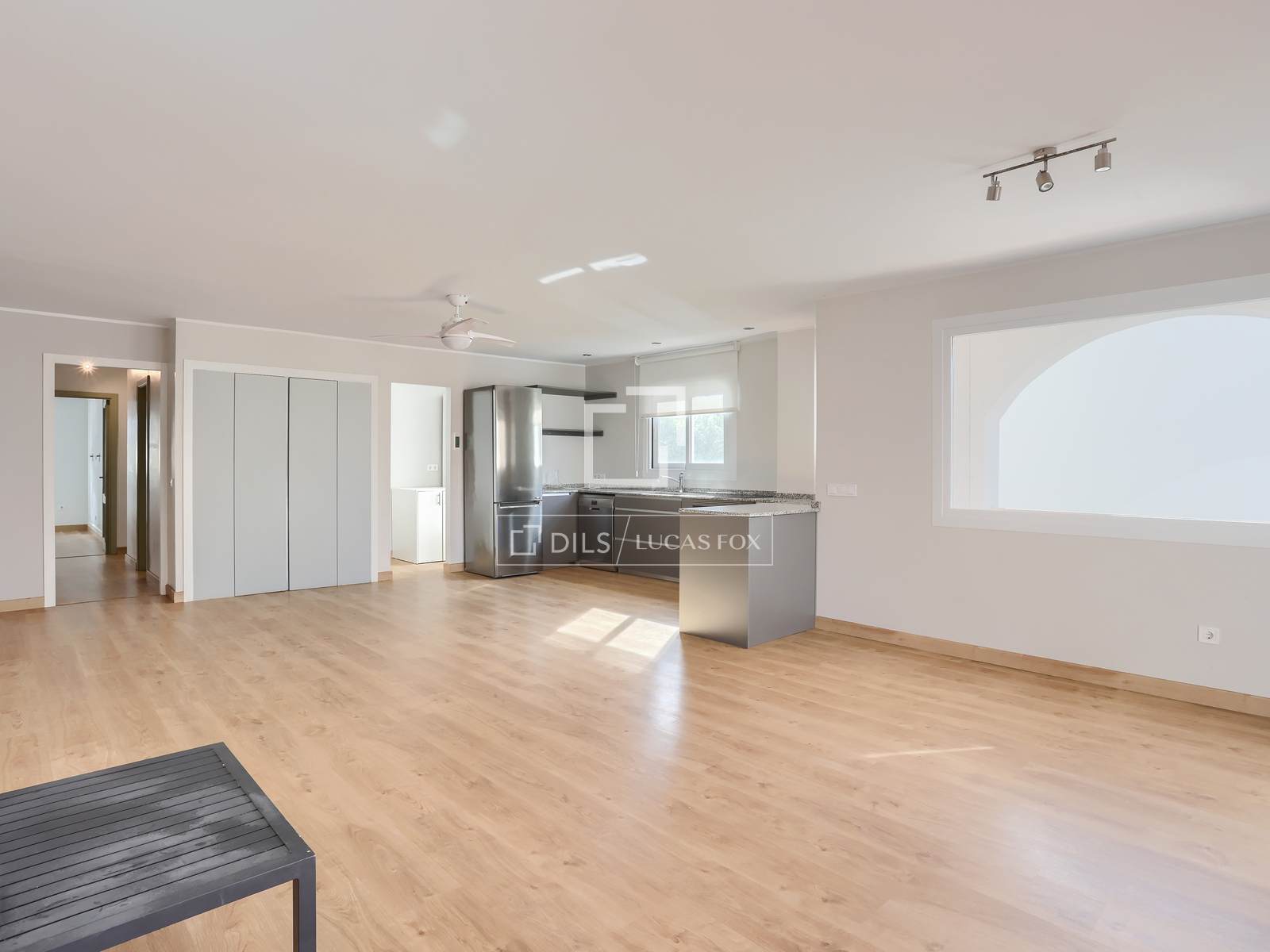 Ingresso che conduce a una cucina open space e a un'ampia zona soggiorno-pranzo