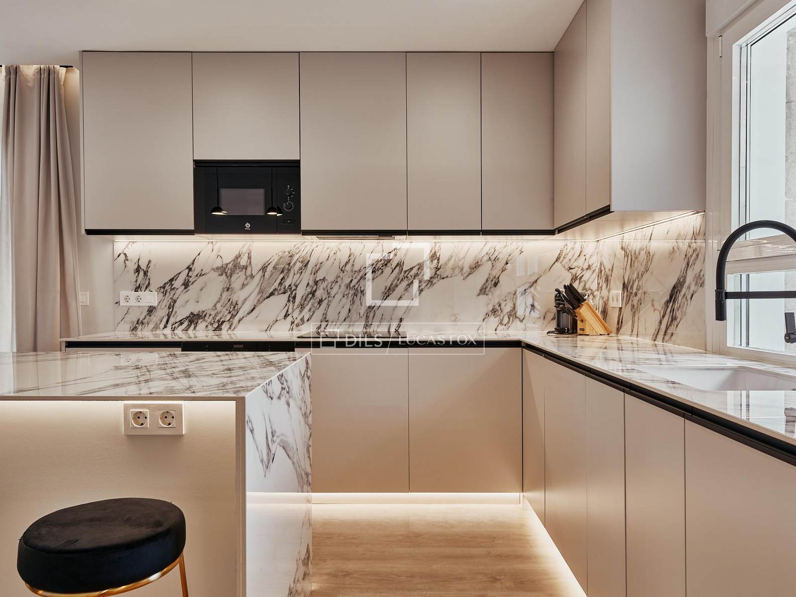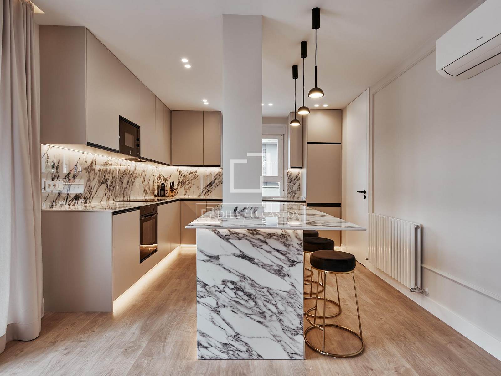 L'appartamento si trova al settimo piano di un edificio residenziale del 1964 dotato di ascensore e servizio di portineria. Ha una superficie di circa 158 m² ed è stato completamente ristrutturato con un design contemporaneo e un'accurata selezione di materiali e finiture di alta qualità.